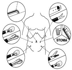 Se insera 5 trocare in jurul ombilicului, intr-un semicerc cu deschiderea spre pelvis (Fig. 19). Se instituie pneumoperitoneul cu un ac Veress. Se introduc 4 trocare de lucru de 12 mm, in dreapta si in stanga abdomenului inferior, acestea fiind singurele utilizabile pentru staplerele liniare. Trocarul superior stang este plasat la nivelul marcajului pentru situsul de stomie.