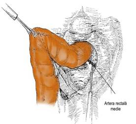 Apoi, in mezorect se va ligatura trunchiul hemoroidal superior, daca nu s-a ligaturat pediculul mezenteric inferior dupa originea arterei colice stangi (Fig. 6). Inapoia vaselor hemoroidale superioare se poate deschide cu foarfecele bont spatiul celulos avascular dintre teaca rectului si fascia presacrata (Fig. 7). Spatiul corect se recunoaste dupa usurinta cu care se face decolarea si dupa absenta sangerarii.