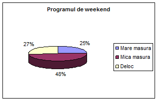 Angajatii care sunt nemultumiti in mare masura de programul de weekend (25%) lucreaza in farmaciile cu program prelungit ,de 12 ore pe zi.Restul sunt nemultumiti in mica masura (48%) sau deloc (27%).