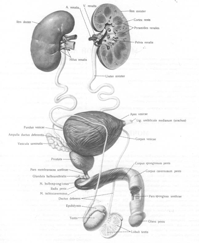 Uretra incepe la nivelul orificiului uretral al vezicii urinare si se termina la nivelul meatului urinar, situat la capatul liber al glandului peni suin i. Uretra se imparte in patru portiuni: portiunea intramurala, de la baza vezicii urinare, foarte scurta; portiunea prostatica, lunga de 3 cm, care trece prin prostata (pars prostatica); portiunea membranoasa (pars membranacea), ce strabate diafragma urogenitala; portiunea spongioasa (pars spongiosa), inglobata in corpul spongios al penisului (in corpul cavernos al uretrei).