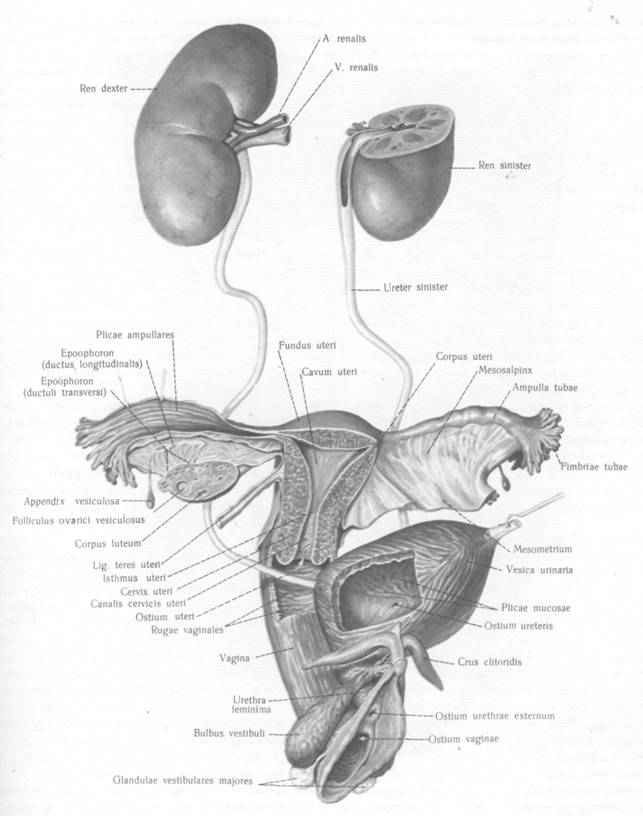 La femeie este de mentionat ca, in segmentul parietal, fata laterala a ureterului e incrucisata de artera uterina, ram din artera iliaca interna, iar fata mediala e acoperita de .peritoneu, delimiteaza fosa ovariana si are astfel raporturi cu ovarul. Segmentul visceral, orientat tot transversal, are o prima parte chiar in baza ligamentului larg al uterului unde, de asemenea, contracteaza un important raport cu artera uterina, care il incruciseaza anterior, iar apoi trece inaintea vaginei si se deschide in vezica. Acest raport este foarte important si de el trebuie sa se tina seama la efectuarea histerectomiei (ablatia uterului), intrucat exista un real pericol de lezare intraoperatorie a ureterului.