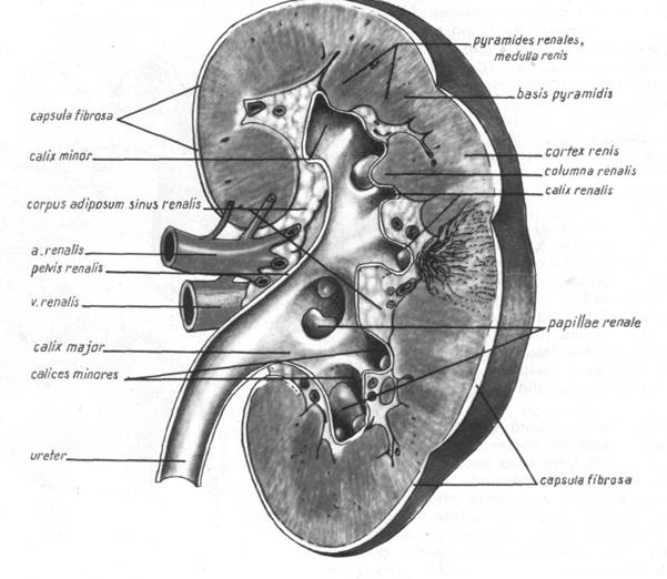 Rinichiul, bazinetul si ureterul (sectiune longitudinala)