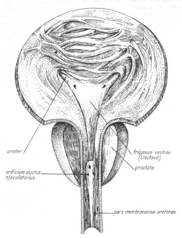 In interior, vezica prezinta urmatoarele elemente structurale: la nivelul fundului vezicii exista o zona neteda, lipsita de plice, de forma triunghiulara, in ale carei unghiuri posterioare sunt orificiile ureterale, iar in unghiul anterior, orificiul uretrei; este numit trigonul vezical (trigonum vesicae) al lui Lieutaud.