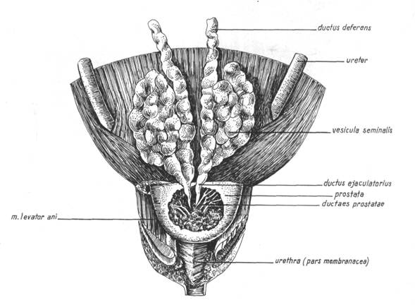 De o parte si de alta se deschid canalele ejaculaoare si orificiile celor 30-50 de glande tubulo-alveolare proprii, care sunt infasurate de tesut conjunctiv si fascicule de musculatura neteda, ce alcatuiesc asa numitul muschi prostatic.
