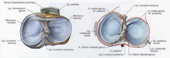 Meniscurile intraarticulare. Datorita asimetriei condililor, concordanta dintre suprafetele articulare se realizeaza prin interpunerea a doua formatiuni fibrocartilaginoase, numite meniscuri. Acestea au forma unor inele incomplete, situate la periferia suprafetelor articulare tibiale, acoperind circa 2/3 din acestea.