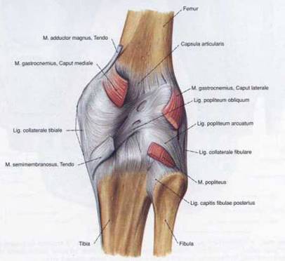 Ligamentul popliteu arcuat (Lig. popliteum arcuatum), bandeleta concava in sus, asezat transversal pe fata posterioara a capsulei articulare.