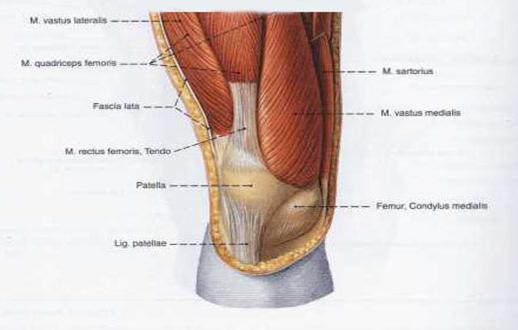 1. Cvadricepsul femural se insera printr-un tendon comun la baza rotulei, care apoi continua fara intrerupere sub forma ligamentului patelar si se fixeaza pe tuberozitatea tibiei. Tendonul este format din trei straturi tendinoase suprapuse; lama superficiala alcatuita de tendonul dreptului femural, lama mijlocie de tendoanele vastilor medial si lateral si cea profunda de tendonul vastului intermediar. Cvadricepsul mai emite doua expansiuni juxtarotuliene, numite retinaculele patelei, de la marginile rotulei la condilii tibiali corespunzatori. Aceste retinacule, numite si "aripioarele rotulei" reprezinta in realitate un complex fibros de ancorare a rotulei, cu rol deosebit in mentinerea pozitiei acesteia si in miscarile de extensie ale gambei.