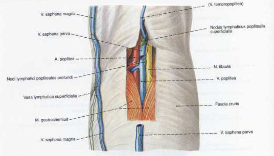 b. Vena poplitee, unica (rar poate fi si dubla) se situeaza dorso-lateral de artera, ambele fiind cuprinse intr-o teaca conjunctiva. Primeste un numar mare de afluenti: vena safena externa si venele genunchiului care insotesc cate doua, arterele articulare. Vena safena externa, la nivelul pliului de flexie a genunchiului patrunde profund, realizand jonctiunea safeno-popliteana.