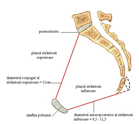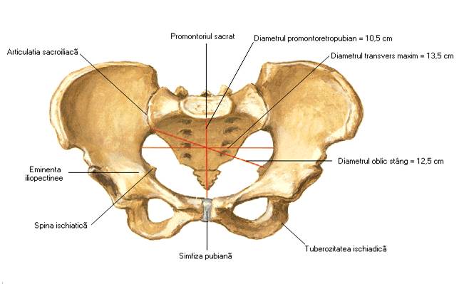 Diametrul anteroposterior - uneste extremitatea superioara a simfizei pubiene si procesul spinis al celei de a 5-a vertebre lombare, masurand 20 cm