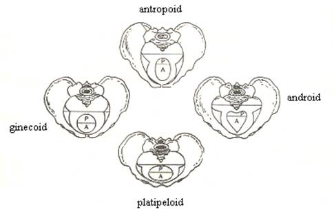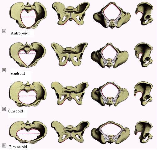 E. Clasificarea Caldwell-Moloy - in functie de diametrele stramtorii superioare se descriu 4 tipuri de configuratii pelvine, cu importanta deosebita in actul travaliului: