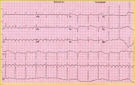 EKG (Fig.2) : Flutter atrial (FiA) cu conducere variabila, 114 b/min. Axa QRS +60 0 cu modificari secundare de repolarizare.