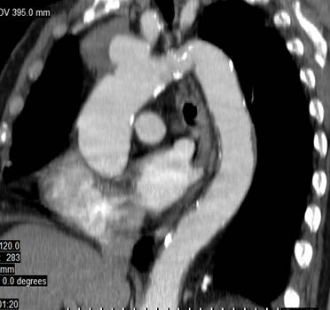 Fig.6 Tomografie computerizata: anevrism sacciform de crosa aortica, partial trombozat.