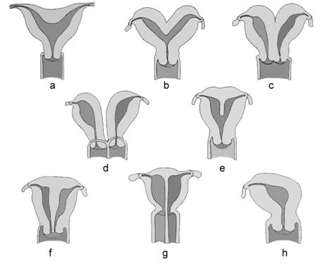 Fig. nr. 97. Prezentarea schematica a malformatiilor uterine (a. uter arcuat, b. uter bicorn unicol, c.uter dublu bicornuat, d. uter didelf(uter dublu col dublu ), e. uter subseptat, f. uter septat complet, g. sept longitudinal vaginal,cervical si uterin, h. uter unicorn) adaptat dupa Merz [2].