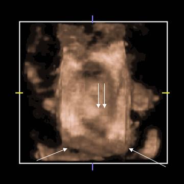 Fig. nr. 99. Ecografia abdominala 3 D de suprafata, indica prezenta unui nodul fibromatos (cu doua sageti) intre cele doua corpuri uterine (cu cate o sageata) la aceeasi pacienta ca in figura precedenta