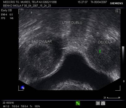 Fig. nr. 101. Uter dublu cu un sac ovular intr-un corp uterin si endometru decidualizat in celalat corp, la ecografia vaginala in sectiune transversala