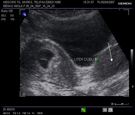 Sarcina va modifica aspectul ecografic al uterului malformat; in prezenta unui uter dublu, unul va contine un sac ovular, iar celalalt va avea un endometru ingrosat decidualizat.