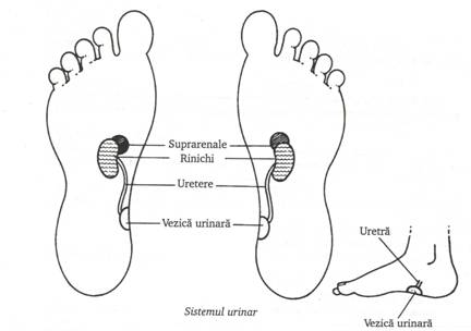 Zonele reflexogene pentru rinichi sunt situate in mijlocul talpilor in dreptul degetului 3, la unirea treimii externe cu treimea interna, imediat sub linia diafragmului (linie ce separa partea carnoasa, corespunzatoare toracelui, de scobitura), iar cele ale suprarenalelor imediat deasupra zonelor renale. Se maseaza rinichiul si glanda suprarenala, de sus in jos, pe o distanta de 1-2 cm, alternativ cu degetele mari de la mana. Zonele reflexogene ale ureterelor se intind de la rinichi pana la marginea latero-interna a piciorului, unde se termina cu zona vezicii urinare. De aici, de la vezica, porneste un mic tubulet, uretra, care merge pana pe insertia tendonului lui Achile pe os. In timpul reflexoterapiei, un deget coboara dinspre rinichi spre vezica presand, degetul mare de la cealalta mana urca pe traiectul uretrei, mangaind, iar cele doua degete se intalnesc in vezica. De aici, degetele reiau traseul invers: mana ce a venit dinspre uretra coboara acum presand, cealalta urca la rinichi, mangaind.