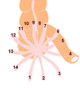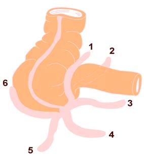 2 - retroileal; 3 - mezoceliac; 4 - pelvin; 5 - descendent; 6 - laterocecal (dupa R. Maingot)(10)