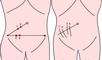Dreapta: Inciziile pentru apendicectomie: 1 - Roux; 2 - McBurney; 3 - Schuller; 4 - Jalaguier