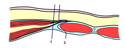 Fig. 4 - Cai de abord pentru apendicectomie: 1. Schuller; 2. Jalaguier (dupa P. Simici)(5)