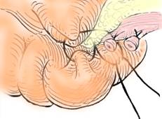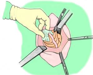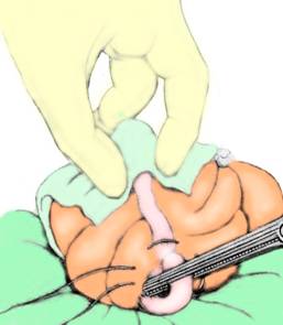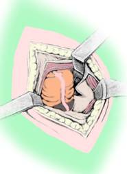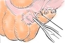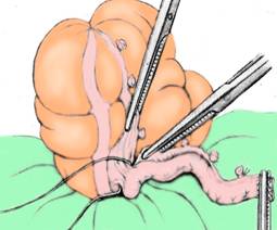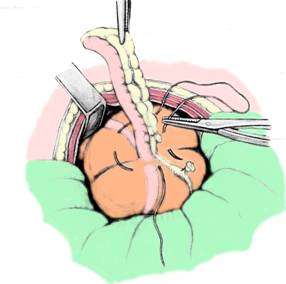 3. Exteriorizarea cecului, dupa izolarea corecta a peretelui, se face prin apucare si tractiune spre exterior cu o pensa atraumatica sau cu doua degete, prin intermediul unei comprese (Fig. 5).
