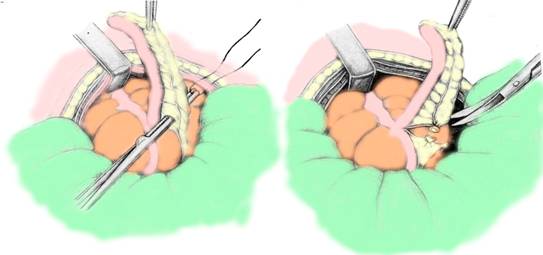 Fig. 12 - Apendicectomia retrograda. Stanga: identificarea bazei apendicelui;