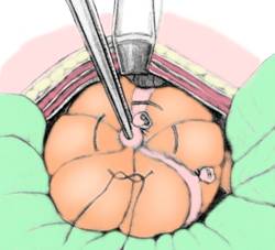 5. Ligatura apendicelui la baza, cu fir subtire neresorbabil sau fir cu resorbtie lenta, poate fi dubla (cand nu se face bursa) (Fig. 8).