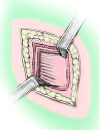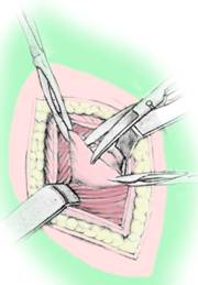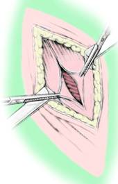 Se practica o incizie de 4 cm, verticala, plasata pe linia spino-ombilicala, putin mai intern de marginea laterala a dreptului abdominal, care intereseaza pielea si tesutul subcutanat (Fig.3). Se sectioneaza vertical foita anterioara a tecii dreptului, evitand intersectiile musculare in care se gasesc si vase (Fig. 4). Corpul muscular va fi retractat spre stanga cu ajutorul unui departator Farabeuf, evidentiindu-se foita posterioara a tecii dreptului impreuna cu peritoneul, care se sectioneaza intre doua pense anatomice cu dinti, dupa ce ne-am convins ca nu am prins in pensa nici un organ intraabdominal.