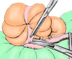 7. Sectionarea apendicelui se realizeaza dupa izolarea prin comprese mari a campului operator. Tractionand pensa care fixeaza varful apendicelui, se prezinta baza acestuia cu firul de ligatura ancorat cu o pensa Pean. Imediat deasupra nodului se prinde apendicele intre bratele unei pense Kocher, care se strang fara a strivi, alunecand in acelasi timp catre varf, pe circa 0,5 cm, pentru a goli lumenul de continutul septic. Cu bisturiul muiat in iod se incizeaza seromusculoasa, apoi mucoasa, care se extirpa cat mai mult.