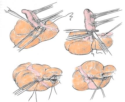 Fig. 13 - Apendicectomia retrograda: ligatura pas cu pas a vaselor si eliberarea varfului (dupa P. Simici) (5)