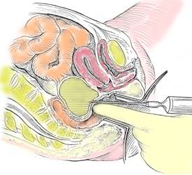 Fig. 16 - Deschiderea unui abces pelvin prin colpotomie (dupa Maingot)(10)