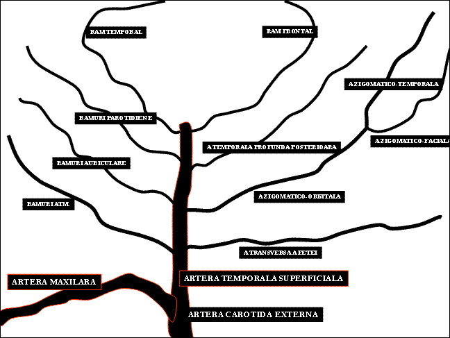In traiectul sau, artera temporala superficiala emite sase ramuri: