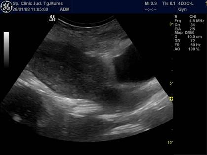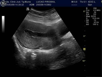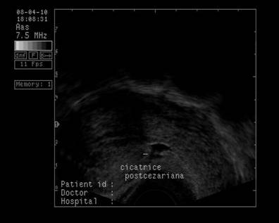 Fig. Nr. 336 Pacienta la peste un an dupa a doua operatie cezariana, ecografie vaginala, cu linie imaginea anecogena indusa de cicatricea peretelui anterior istmic uterin