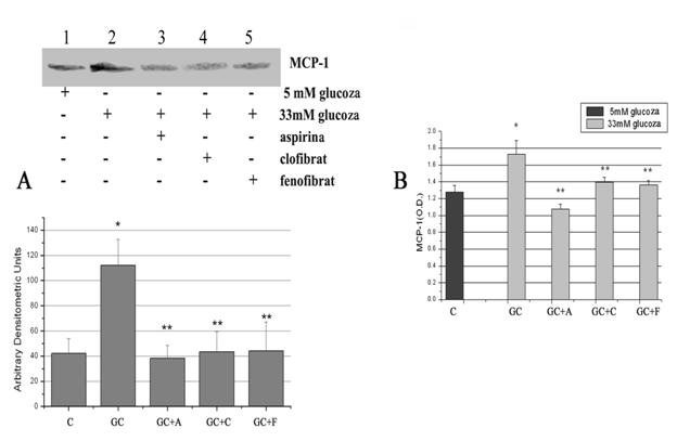 Pentru a testa rolul aspirinei si activatorilor de PPAR-α asupra expresiei MCP-1 indusa de glucoza crescuta, celulele endoteliale confluente, crescute in conditii normale de glucoza (5mM) au fost supuse diferitelor conditii experimentale: (i) celule expuse la concentratie crescuta de glucoza (33mM), timp de 48 ore (GC); (ii) cellule expuse la 33mM glucoza in prezenta de 1mM aspirina (GC+A); (iii) cellule mentinute in glucoza crescuta timp de 24h si apoi incubate pentru inca 24h cu 100μM fenofibrat (GC+F) sau 100μM clofibrate(GC+C); si (iv) celule mentinute in mediu de cultura cu 5mM glucoza, celule control.