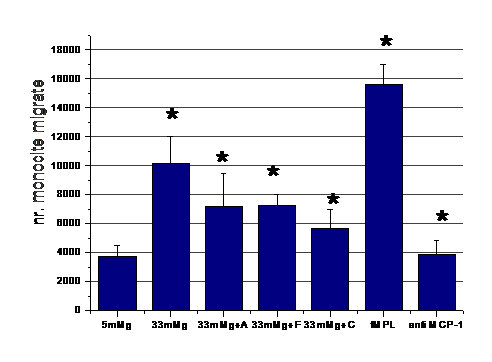 In continuare am urmarit rolul functional al MCP-1, de chemoatractant pentru monocite. Celulele endoteliale au fost activate cu concentratie crescuta de glucoza, in prezenta sau absenta de medicamente. La sfarsitul perioadei de incubare mediul conditionat de la diferitele probe a fost recuperat si pus in compartimentul de jos al camerelor de chemotaxie. In compartimentul de sus au fost puse monocitele. A urmat o perioada de incubare de 90 minute la 37 C. Control pozitiv a fost realizat prin adaugarea in compartimentul de jos de mediu simplu cu peptidul chemotactic fMPL, iar control negativ prin adaugarea mediului conditionat de la celulele activate de glucoza de anticorp anti MCP-1, care sa anihileze MCP-1. Rezultatele obtinute arata ca procesul de transmigrare al monocitelor prin filtrul camerei de chemotaxie este crescut in conditii de activare cu glucoza (figura 3). Efectul de reducere a expresiei MCP-1 de catre medicamentele folosite se reflecta in numarul redus de monocite care au suferit procesul de chemotaxie. De asemenea, putem observa ca anihilarea MCP-1 de anticorpul monoclonal specific, implica numar redus de monocite care transmigreaza prin camera de chemotaxie.
