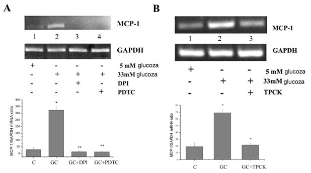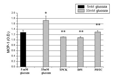 Inainte de a studia mecanismele implicate in efectele medicamentelor asupra expresiei MCP-1, am incercat sa identificam modul in care glucoza crescuta induce expresia MCP-1. Dat fiind ca anterior am aratat ca celulele endoteliale umane activate cu glucoza crescuta produc nivele crescute de ROS [Dragomir et al 2004] si ca stresul oxidativ activeaza factorii de transcriptie implicati in expresia moleculelor proinflamatoare, ne-am intrebat daca ROS si factorul de transcriptie NF-kB sunt implicati in supra-expresia MCP-1 de catre glucoza. In acest sens am testat efectul unor inhibitorilor de ROS (DPI si PDTC) si a inhibitorului de NF-kB (TPCK) asupra expresiei genice si proteice a MCP-1. Dupa cum putem observa in figura 4, A si B ambii inhibitori de ROS dar si inhibitorul de NF-kB scad semnificativ (p<0.01 in cazul DPI, p< 0.005 in cazul PDTC si p<0.05 in cazul TPCK) expresia genica a MCP-1, validand implicarea speciilor reactive de oxigen si a NF-kB in inducerea expresiei MCP-1.