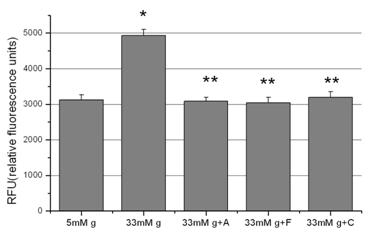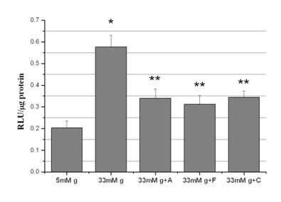 Pentru a determina rolul NADPH oxidazei in producerea de ROS, am facut experimente in care activitatea enzimei a fost masurata in celule control, celule expuse la 33mM glucoza si celule expuse la 33mM glucoza si tratate cu medicamente, dar activitatea enzimei a fost determinata in prezenta de inhibitorul specific al NADPH oxidazei, DPI (10mM). In aceste conditii, in toate cazurile, activitatea NADPH oxidazei a fost redusa la acelasi nivel. In contrast, inhibitori ai altor surse de ROS, ca allopurinol (inhibitor al xantin oxidazei), NG-nitro-L-arginine methyl ester (inhibitor al sintazei oxidului nitric) si rotenona (inhibitor al oxidazei lantului transportor de electroni mitocondrial) nu au avut efect. Aceste date sugereaza ca glucoza a stimulat producerea ROS in CE prin activarea NADPH oxidazei.