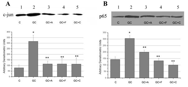 NF-kB si AP-1 sunt doi factori de transcriptie implicati in reglarea MCP-1 [Martin et al., 1997; Shyy et al., 1995]. Pentru a testa efectul medicamentelor asupra acestor doi factori de transcriptie, am analizat expresia proteica nucleara a subunitatilor p65 (subunitate a NF-kB) si c-jun (subunitate a AP-1). Rezultatele obtinute arata ca expunerea CE la concentratie crescuta de glucoza timp de 48 ore duce la activarea factorilor de transcriptie NF-kB si AP-1, reflectata in cresterea expresiei nucleare a subunitatilor p65 si c-jun (figura 8, A si B). Aspirina, fenofibratul si clofibratul reduc activarea celor doi factori de transcriptie prin scaderea expresiei subunitatilor p65 (p<0.05) si c-jun (p<0.01).