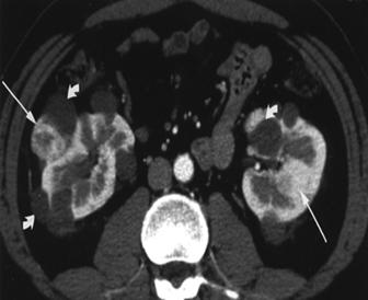 Figura 9.5. Boala von Hippel Lindau- numeroase formatini tumorele solide si chistice. (aspect macroscopic si CT) adaptat dupa Bachir Taouli, Mehdi Ghouadni, Jean-Michel Corras, Pascal Hammel, Anne Couvelard, Stphane Richard and Valrie Vilgrain: Spectrum of Abdominal Imaging Findings in von Hippel-Lindau Disease, American Journal of Roentgenology