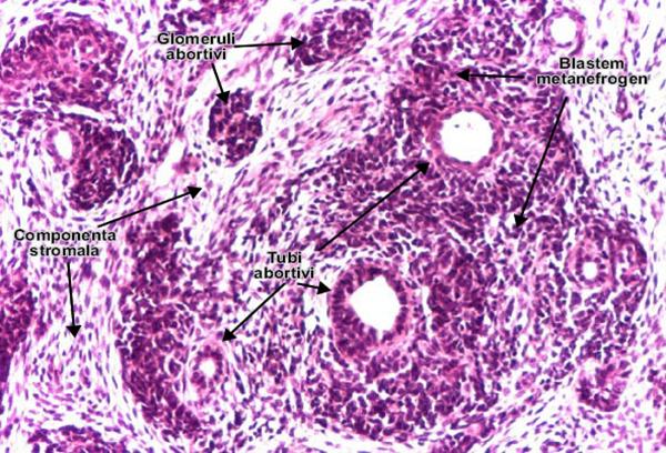 Nefroblastomul este constituit din trei componente, dezvoltandu-se din blastemul metanefrogen si