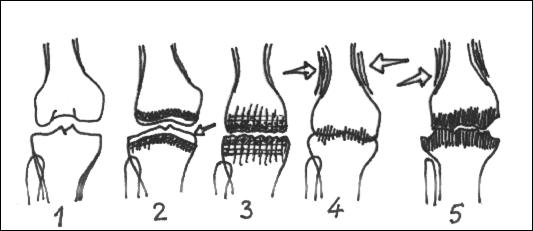 in cazurile in care s-a produs distructia cartilajelor articulare, se creaza conditia pentru producerea unei anchiloze, in perioada de vindecare;
