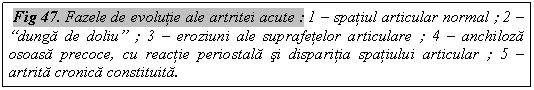 extremitatile osoase prezinta leziuni distructive, cu modificare de ax ale oaselor, pensarea accentuata a spatiului articular, osteofite exuberante;