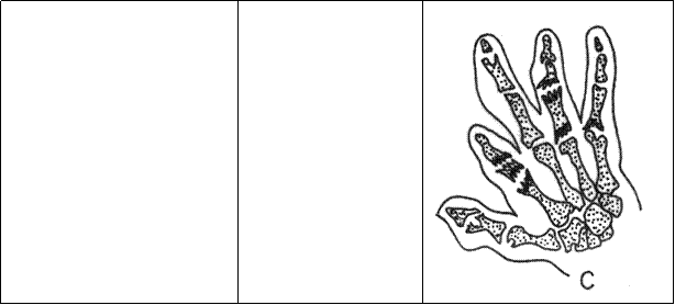 leziunile apar evident la nivelul oaselor mici ale mainilor si picioarelor;