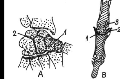spatiile articulare ale carpienelor, metacarpienelor si falangelor sunt pensate , datorita lezarii cartilajelor articulare de catre tesutul de granulatie;