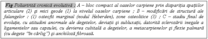 in stadii avansate, spatiile articulare carpiene sunt desfiintate, oasele respective alcatuind un bloc , realizand anchiloze, fibroase sau osoase.