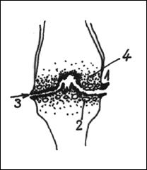 (1), geode (2), ingustarea marcata a spatiului articular cu
