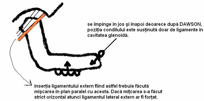 Se impinge in jos si inapoi deoarece dupa DAWSON pozitia condilului este sustinuta doar de ligamente in cavitatea glenoida, si pentru ca miscarea trebuie facuta in plan ║ cu ligamentel ext ale articulatiei.
