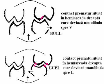 ocluzia centrica presupunea contacte simetrice atat in stanga cat si in dreapta aparatului stomatognat. La aparitia contactului prematur, mandibula va devia (lateral, stanga sau dreapta) pentru a gasi alte contacte multiple pentru masticatie;