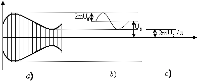 c. Metoda dublei detectii se utilizeaza la aparatele care indica direct gradul de modulatie m. Aceste aparate sunt denumite modulometre. Principiul metodei consta in masurarea gradului de modulatie in amplitudine al unui semnal (fig.7.23,a) prin doua detectii. Dupa prima detectie, cea a semnalului de inalta frecventa (modulat), rezulta un semnal care reproduce infasuratoarea de modulatie (fig.7.23,b). Valoarea medie a semnalului este chiar amplitudinea purtatoarei U0.