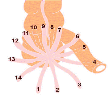 1. cele anterioare converg spre cateva noduri cecale anterioare situate in plica cecala vasculara